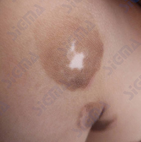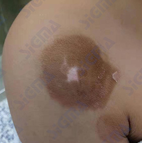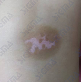 某患者,右肩部一元硬幣大小白斑,使用SIGMA 308 SQ LED治療一個月后,白斑面積明顯縮小;治療兩個月時,白斑恢復70%以上。