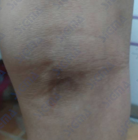 某患者,腿后腘窩處不規(guī)則白斑,2020年10月9日第一次照光治療,使用SIGMA 308 SQ LED。治療一個月白斑明顯縮小,12月24日完全復色,總療程不到三個月。